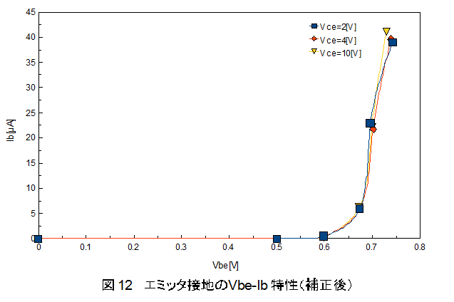 図11では、図9からもわかるようにIcはVcbに関わらず一定で、IcとIbは比例関係にあると言える。このグラフの傾きがαであると言え、その値は常に1以下を保っている。